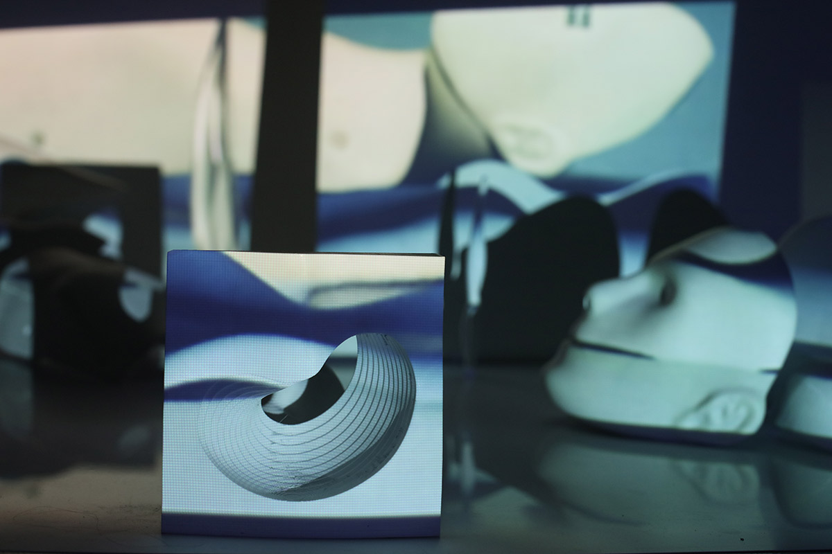 Instalación multimedial compuesta por objetos impresos en 3D y proyecciones de animación 3D.