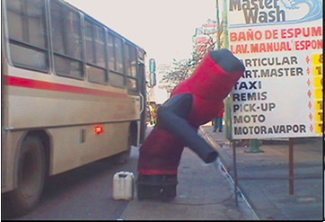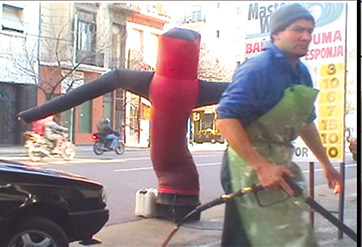 Estos autómatas precarios, y ya obsoletos, son para mí figuras paródicas. Personajes pop, clase b, de nuestro paisaje urbano condenados a su metro cuadrado y animados por un ventilador en su base. Se esfuerzan día y noche para ser vistos y sus movimientos ganan dramatismo con el correr de las horas.